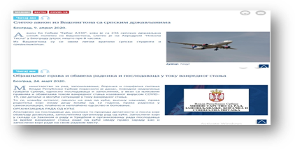 S obzirom na to da je u našoj zemlji Vlada Republike Srbije, kao institucija, nosilac izvršne vlasti, s pravom su postojala očekivanja da će se o ovoj kriznoj situaciji građani obaveštavati pravovremeno, precizno i tačno. Pres služba zadužena za odnose sa javnošću, koja pri njoj funkcioniše, kreirala je, u skladu sa novonastalom situacijom, novu kategoriju na portalu pod nazivom „Vesti Covid19“, dan pre pojave prvoregistrovanog slučaja obolelog od korona virusa, 5. marta 2020. godine. Na portalu je, hronološkim redom, arhivirano 2.320 objava koje se tiču korone, na 145 strana po 16 objava, nastalih tokom poslednje dve i po godine[1]. Ove objave imaju međusobno određene sličnosti, ali i razlike, kako vizuelno, tako i sadržinski.