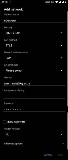 Када завршите са попуњавањем, притисните Повежи (Connect), након чега ћете бити повезани. Подешавање изводите само једном. Сваки следећи пут када се нађете у оквиру Eduroam мреже, ваш Андроид уређај ће се аутоматски повезати.