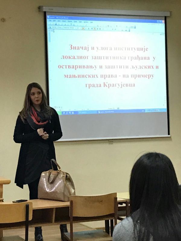 У среду, 28. децембра 2016.године, на Правном факултету Универзитета у Крагујевцу, одржано је предавање на тему: "Значај и улога Заштитника грађана града Крагујевца у остваривању и заштити људских и мањинских права".