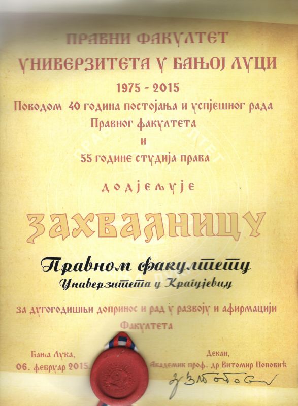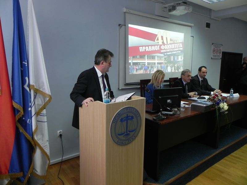 Другог дана, 6. фебруара 2015. године, представници Факултета су учествовали на Међународном научном скупу на тему: "Кривична дјела против човјечности - нормативно и стварно". На Свечаној академији поводом 40 година постојања Правног факултета Универзитета у Бањој Луци, Правном факултету у Крагујевцу је додељена захвалница.