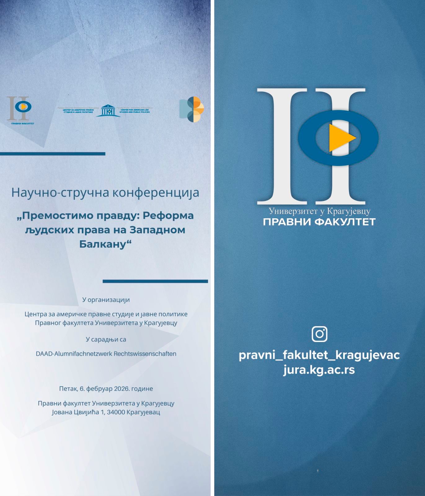 Научнo-стручна конференција под називом „Премостимо правду: Реформа људских права на Западном Балкану“, у организацији Центра за америчке правне студије и јавну политику Универзитета у Крагујевцу, у сарадњи са DAAD-Alumnifachnetzwerk Rechtswissenschaften, биће одржана 6. фебруара 2026. године, са почетком у 10 часова, на Правном факултету Универзитета у Крагујевцу, у конференцијској сали. Програм окупља научнике, креаторе јавних политика и студенте, са фокусом на реформу људских права, приступ правди, медицинску етику и улогу младих правника.