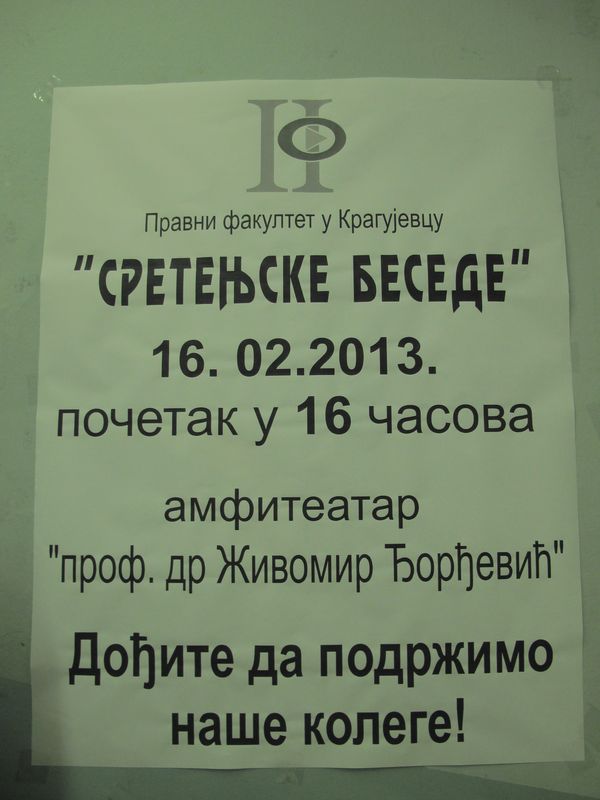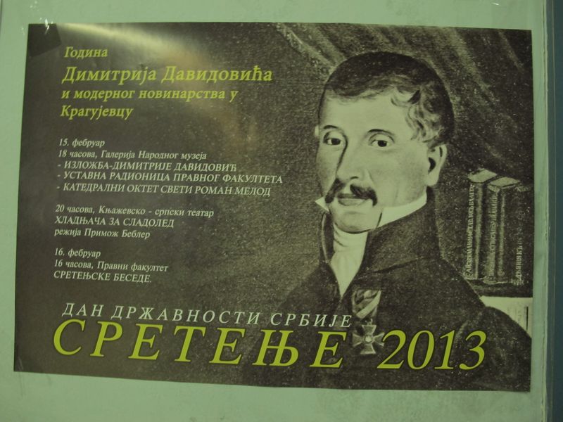 Пето такмичење у говорништву под називом "Сретењске беседе", одржано је у суботу, 16. фебруара 2013. године и формално представља и завршетак званичног обележавања дана српске државности Града Крагујевца у години Димитрија Давидовића и модерног новинарства у Крагујевцу.