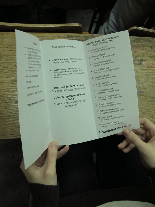 Такмичари су се надметали у две категорије - задата тема ("Honores mutant mores - Почасти мењају понашања" и "Vim vi repellere non est iniuria - Силу силом сузбити нијенеправда") и слободна тема. Такмичење је отворила Александра Јелић (студент четврте године) беседом "Славуј се баснама не хвали", након ње наступила је Славица Пурић (студент прве године) са беседом на тему "Поштујемо себе да би нас други поштовали". Јелена Миливојевић (студент прве године) је говорила на задату тему "Почасти мењају понашања", а на исту тему говорили су и беседници Лазар Петровић (студент друге године), Анка Ђуричић (студент прве године), Борис Лачњевац (студент четврте године) и Маријана Жупањац (студент прве године). Драгана Перовић (студент четврте године) се представила темом "Ко је убио Галилеја?", Ања Живадиновић (студент треће године) задатом темом "Силу силом сузбити није неправда", Кристина Стојадиновић (студент друге године) говорила је на слободну тему под називом "Зашто ћутите?", Срђан Младеновић (студент друге године) темом "Беседа о забораву" и Сања Микић (студент друге године) беседом на тему "Диктатори су ослободили себе, а заборавили народ".