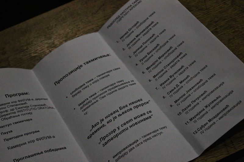 Такмичари су се надметали у три категорије - задата тема - "Ако је новац Бог нашег времена ко је његов пророк" и "Прозор у свет може се затворити новинама"; слободна тема и импровизација.