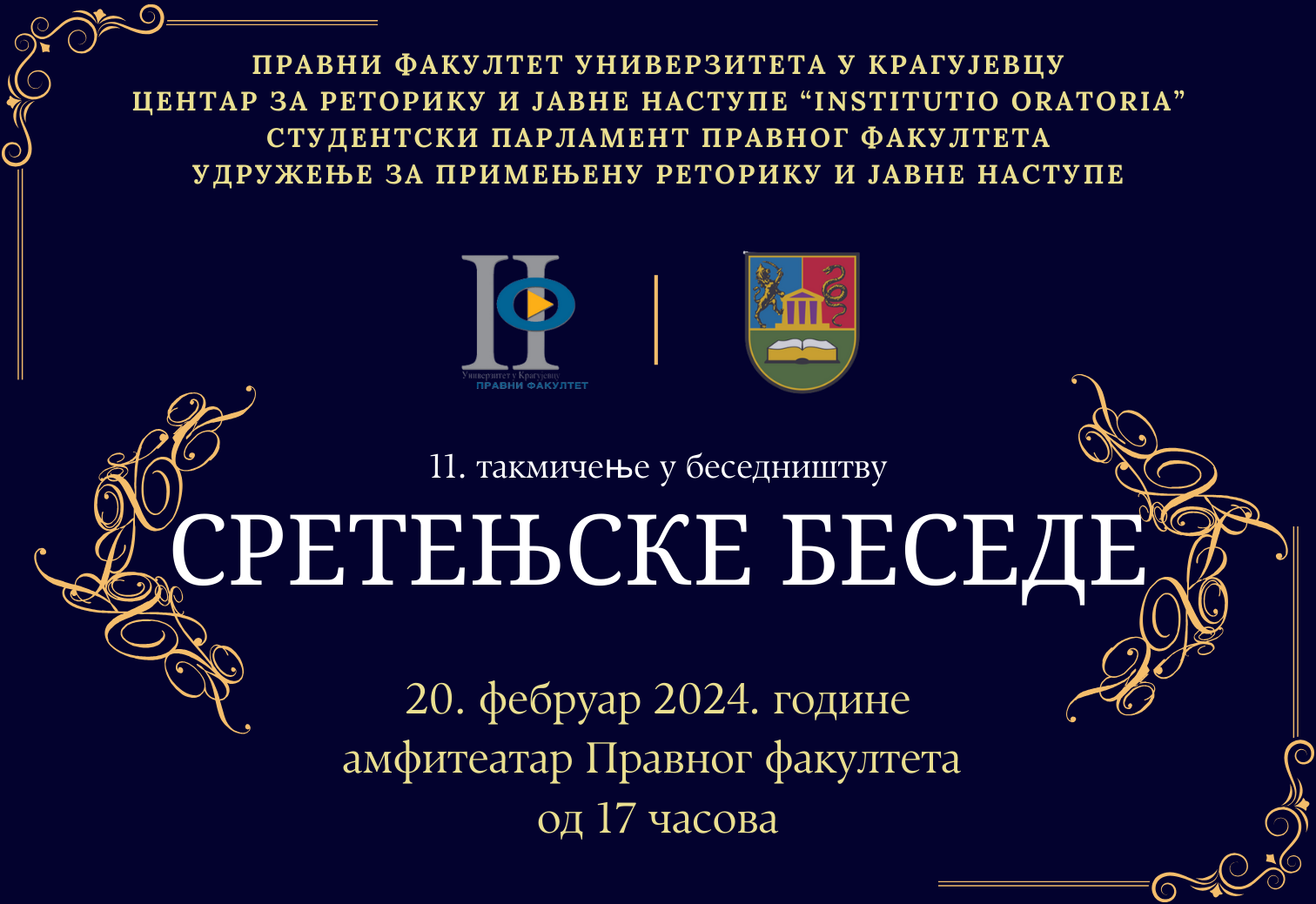 Правни факултет Универзитета у Крагујевцу, Центар за реторику и јавне наступе „Institutio oratoria“, Удружење за примењену реторику и јавне наступе и Студентски парламент Правног факултета позивају вас да присуствујете 11. ТАКМИЧЕЊУ У БЕСЕДНИШТВУ „СРЕТЕЊСКЕ БЕСЕДЕ 2024.“ које ће се одржати 20. 02. 2024. године у 17 часова у амфитеатру Правног факултета.