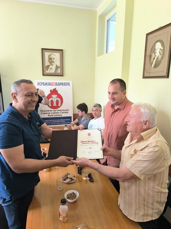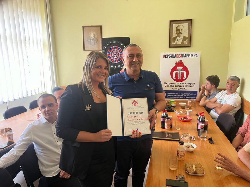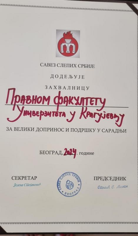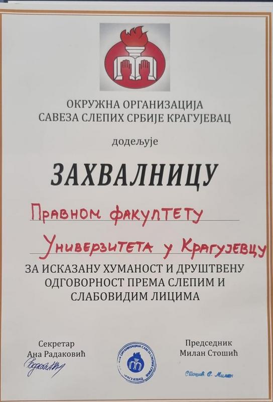 Правном факултету у Крагујевцу додељена захвалница за исказану хуманост и друштвену одговорност према слепим и слабовидим лицима.