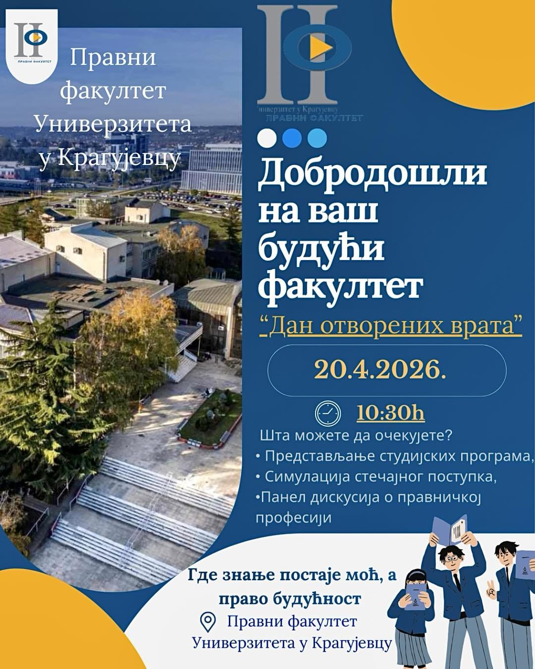 Дана 20.04.2026. године, са почетком у 10.30 часова, на Правном факултету Универзитета у Крагујевцу биће одржан Дан отворених врата.
